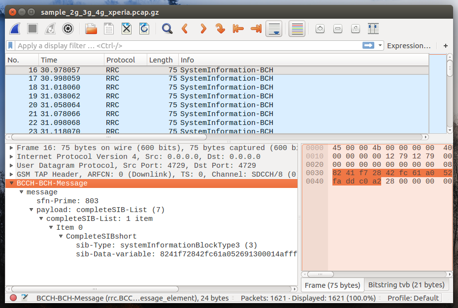 That’s because Wireshark doesn’t know to reassemble SIBs yet (even when there’s no fragmentation but just one chunk of SIB). Fortunately, I have written an option for QCSuper (–reassemble-sibs) that does the reassembly, and puts the SIBs in extra GSMTAP packets that contain only the SIBs. You can find the same PCAP re-generated with this option here.